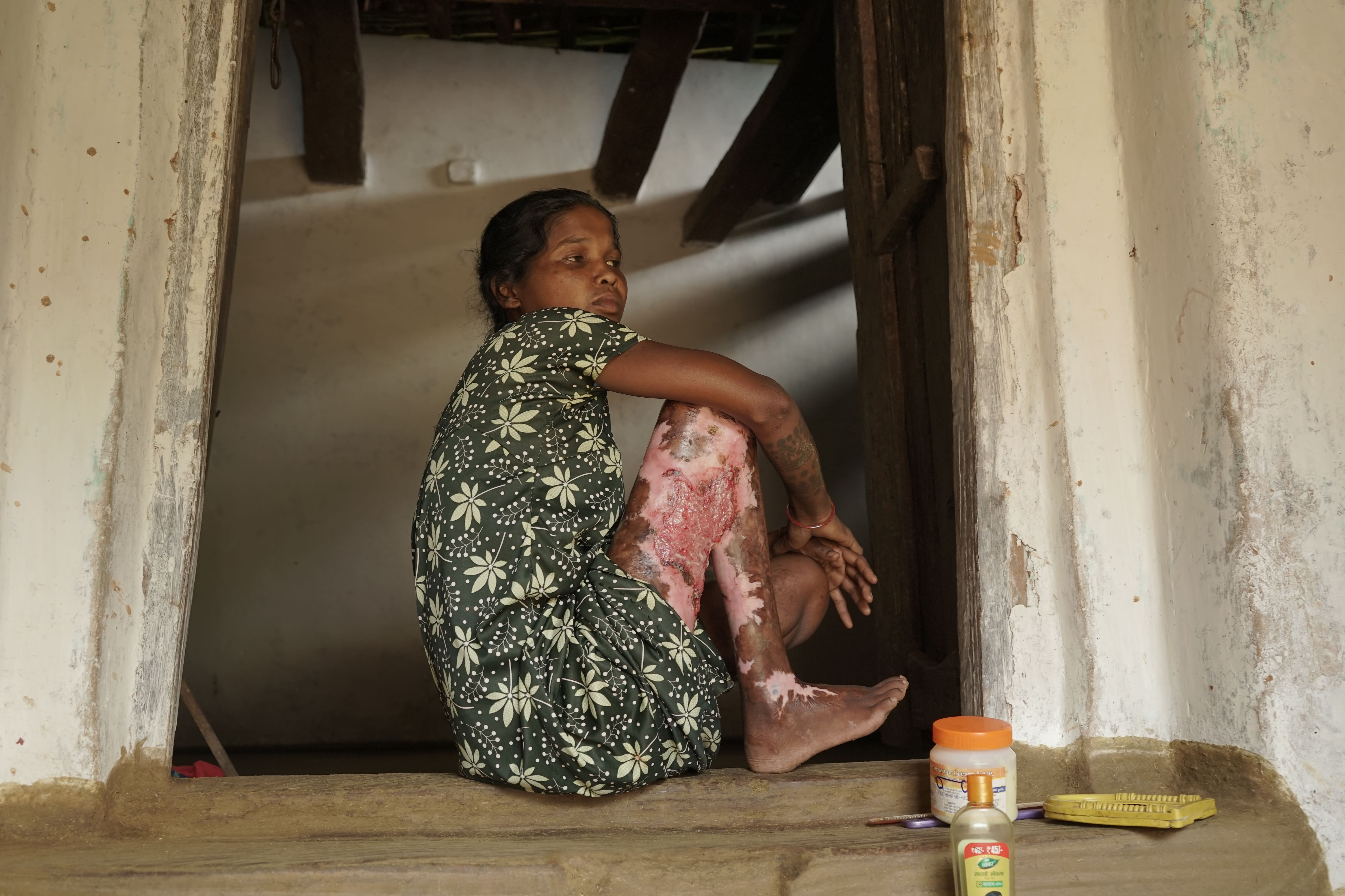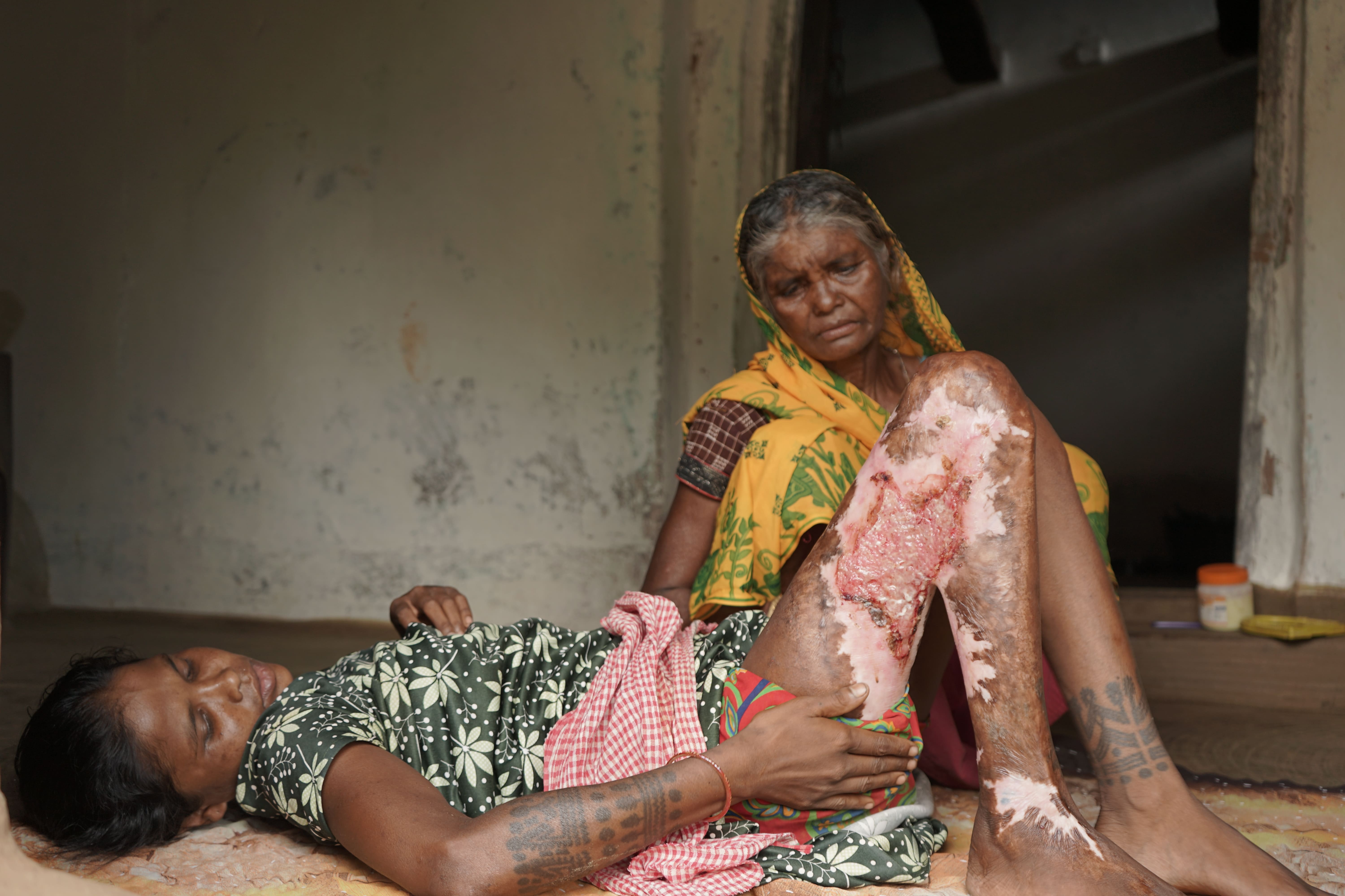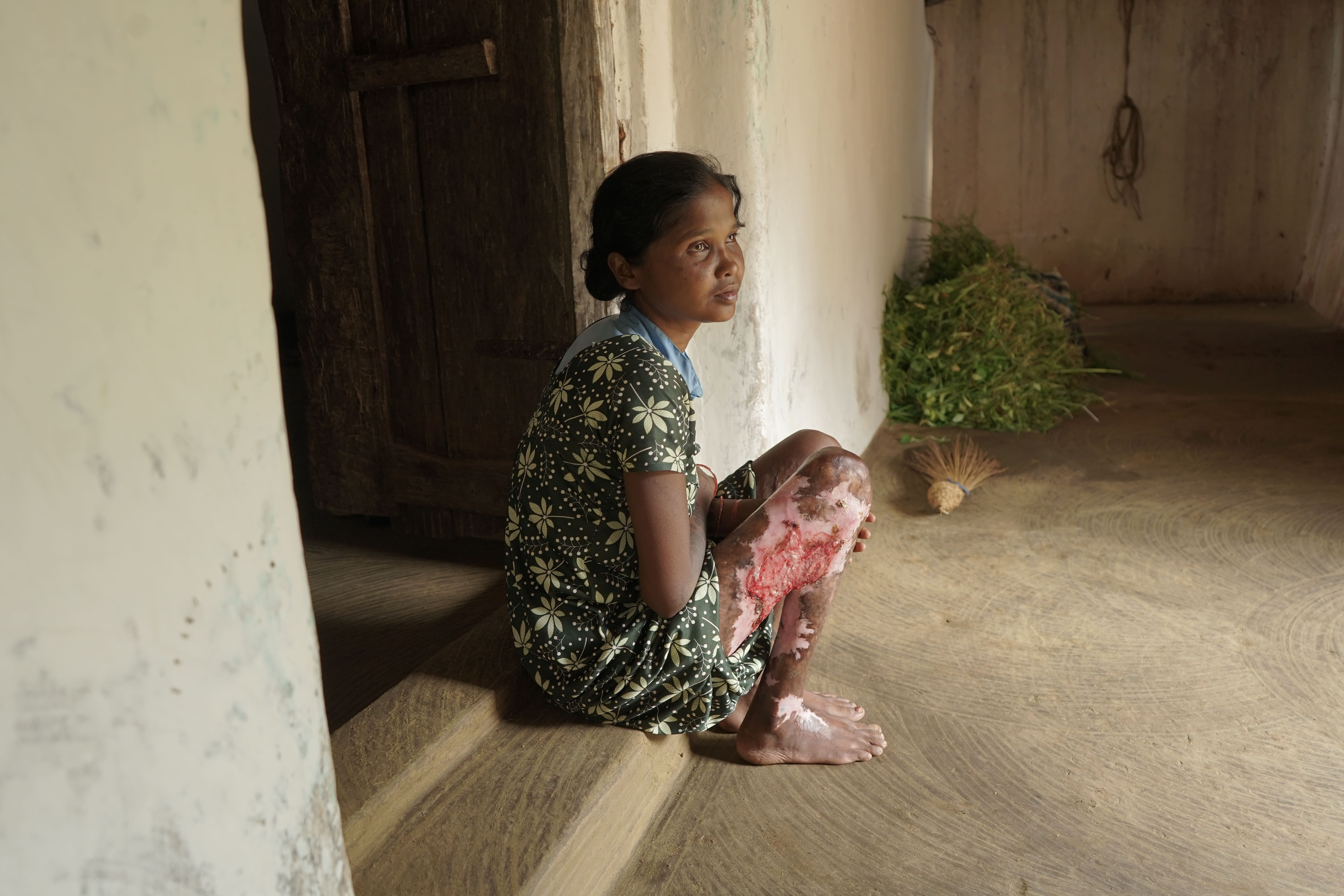 Hirmaniya cannot walk. Her legs and hips are so badly burnt that she can only crawl across the floor. She depends on her mother for even the simplest tasks. Together, they beg for food from neighbors, who sometimes share a little rice or dal-chawal out of kindness.