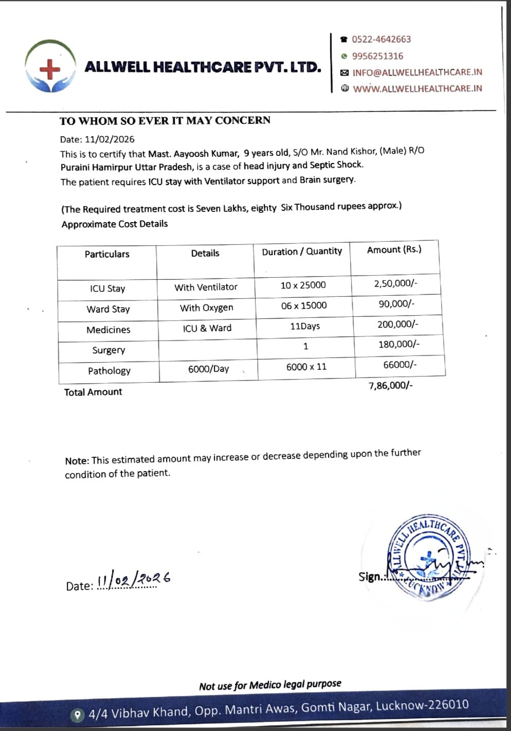 Now, the estimated treatment cost has reached approximately ₹7,86,000. ICU stay with ventilator support, surgery, medicines, pathology, and hospital charges continue to increase as days pass. For a man who struggles to earn even a few hundred rupees a day, this amount feels impossible.