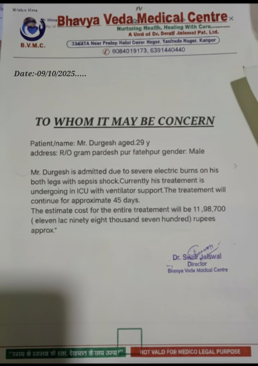 Durgesh was rushed to Bhavya Veda Medical Centre, Kanpur, where doctors found severe electrical burns on both legs and sepsis shock.