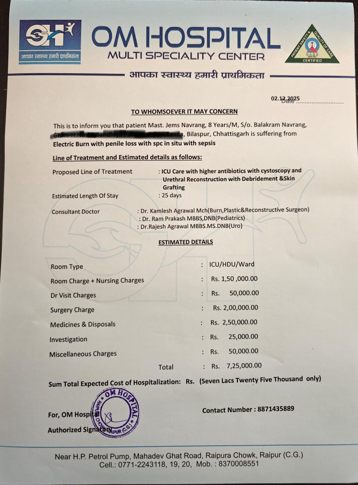 Jems’s father works as a daily wage labourer. His mother is a housewife. They have no savings and no financial support. Even arranging two meals a day is a daily struggle.In a situation where every minute matters, this family did not have the money to admit him to a hospital immediately. They stood helpless as their child cried in unbearable pain. Today, Jems is admitted to OM Hospital in Raipur. He needs urgent reconstructive surgery that will allow him to pass urine again. Without this, his infection will spread and his life will be at risk. The estimated cost of treatment is far beyond what this family can ever arrange.