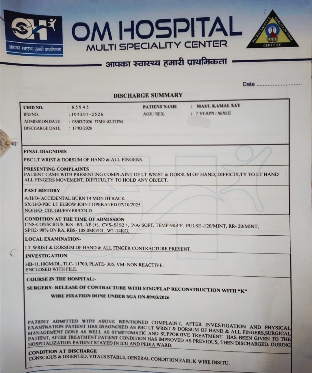 Recently, Kamal underwent an important surgery for his left wrist, hand, and fingers. The procedure has brought improvement, and he is now stable and slowly recovering. This step has given him hope to regain movement and live a more normal life.
