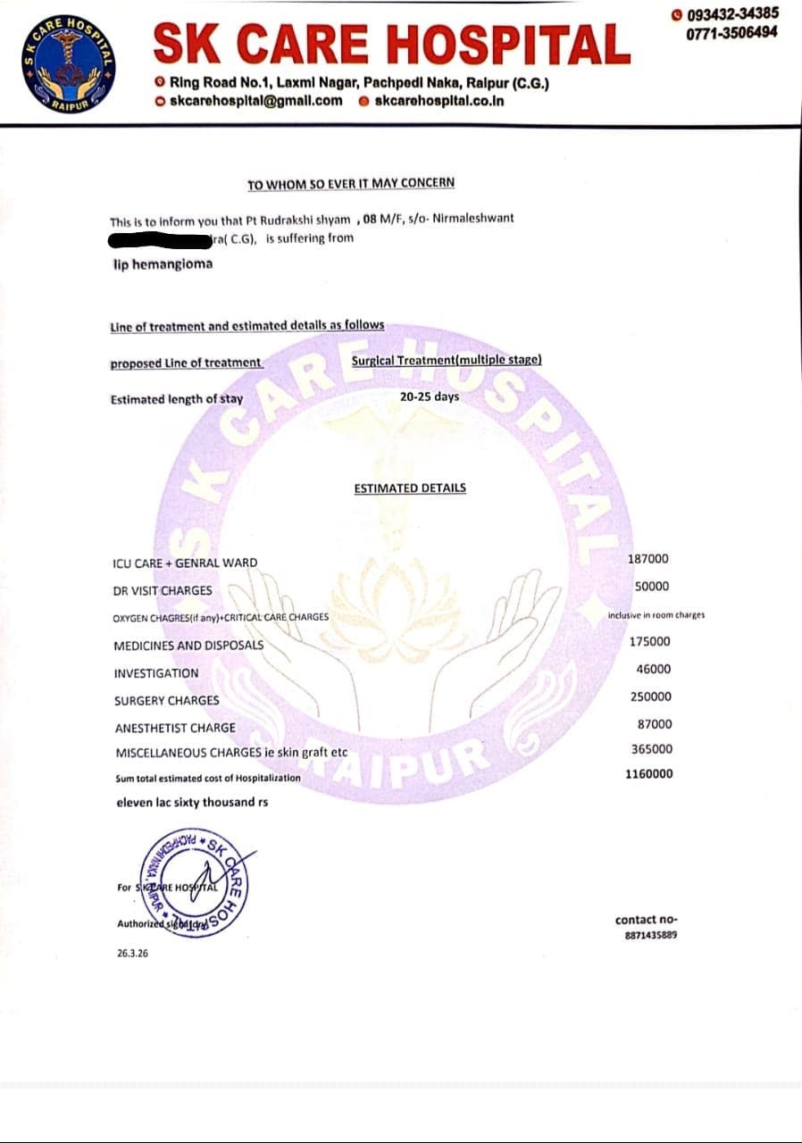 Doctors at SK Care Hospital, Raipur have advised multiple-stage surgical treatment for Rudrakshi.