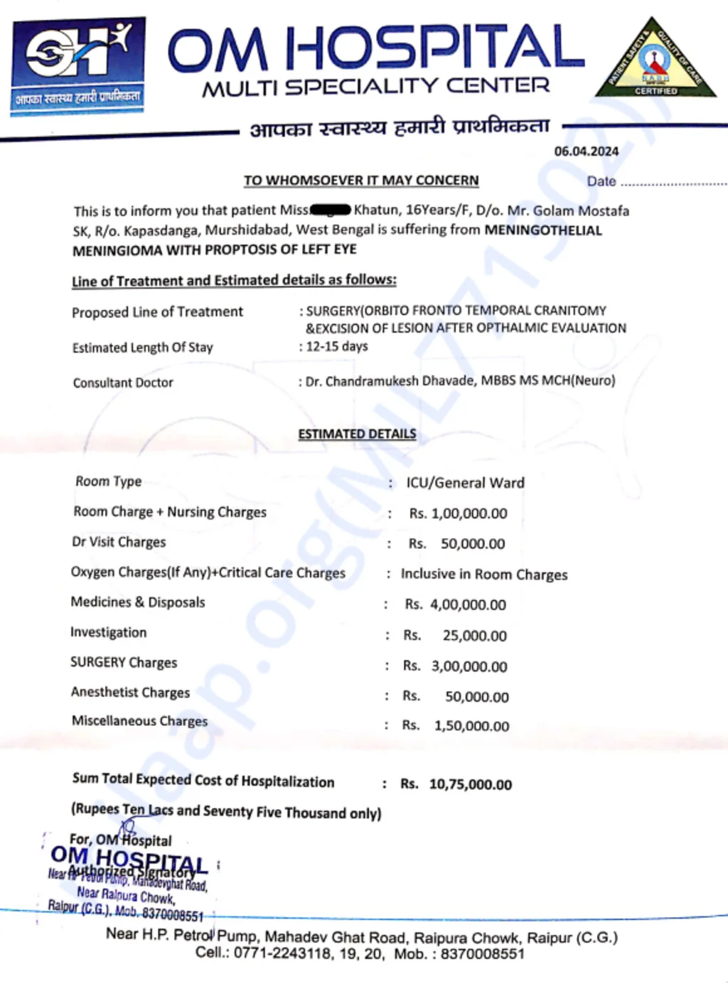 My daughter, my determined young girl of 16, is battling a serious medical condition that threatens not only her health but also her future. my family is carrying a heavy burden - Golam Mustafa Sk., father For the past six years, a large tumor has been growing in his daughter brain, which has caused a serious condition where her left eye bulges out from its socket.