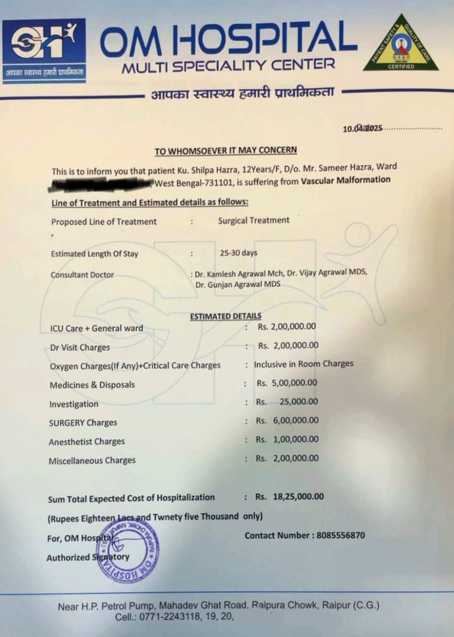 Shilpa is now medically stable and ready for her first surgery. Her condition has been closely monitored, and doctors have prepared a treatment plan to begin addressing the vascular malformation.