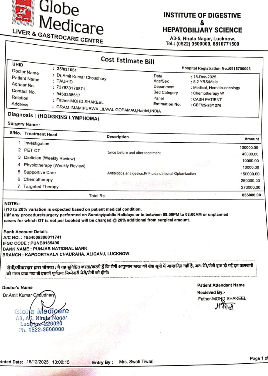 The doctors have clearly said his treatment must continue without delay. The total cost of his complete treatment is ₹8,35,000. It includes investigations, PET-CT scans, chemotherapy, targeted therapy, physiotherapy, dietician reviews, and supportive care. If the treatment stops, the cancer can spread and his recovery chances may reduce.