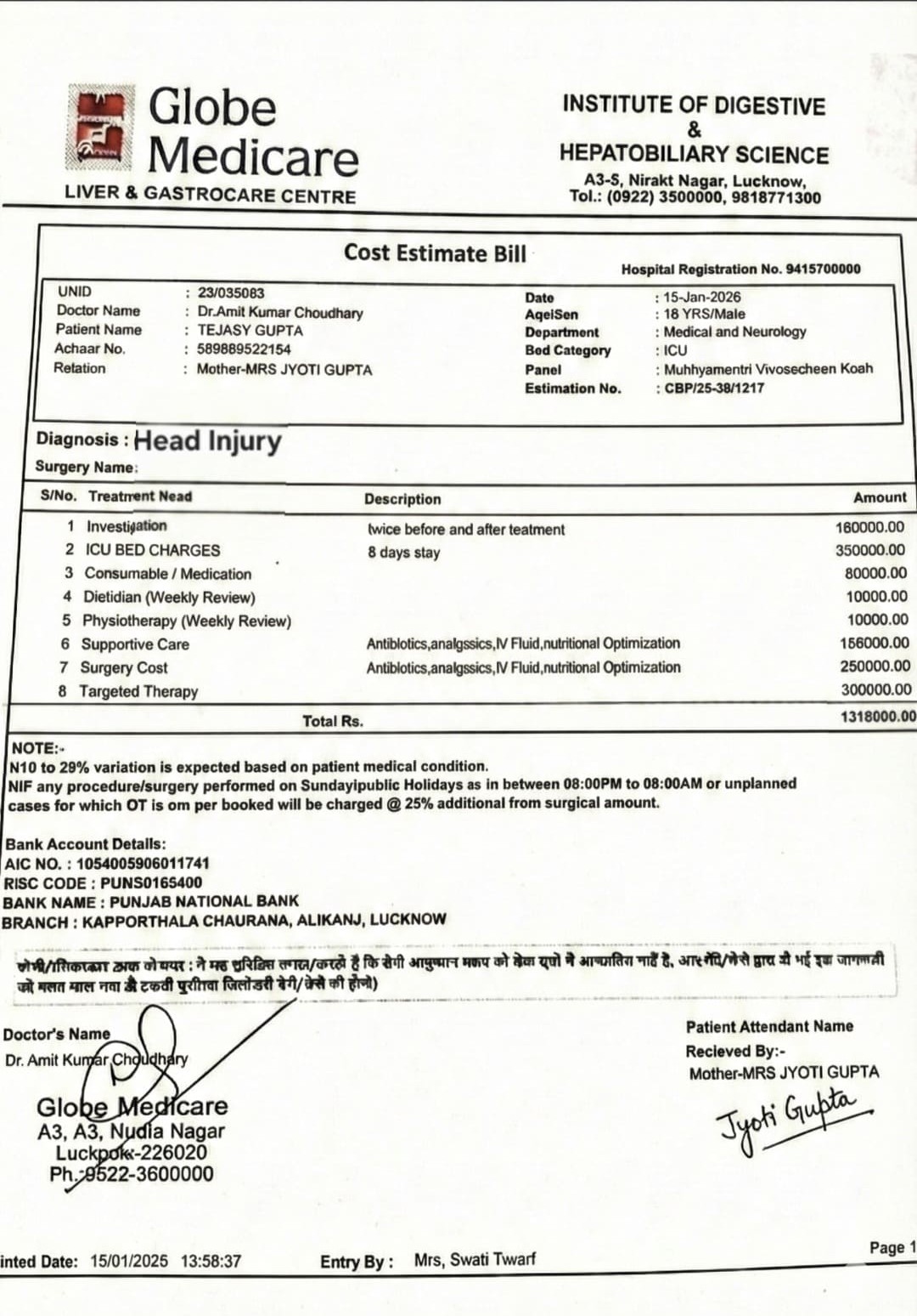 Doctors have made it clear Tejas’s treatment is long, complex, and expensive. Without financial support, the treatment cannot continue. This family is not asking for comfort. They are asking for a chance to keep their son alive.