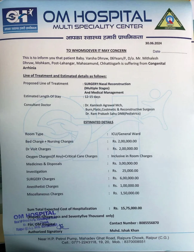 The family has sought medical help, and Varsha is currently admitted to OM Hospital in Raipur. The doctors have provided a quotation of 15,75,000 INR for nasal reconstruction surgery, a figure that is utterly unattainable for the Dhruv family. This surgery is crucial for Varsha’s survival and quality of life, as it would significantly improve her ability to breathe, eat, and engage with her peers without feeling self-conscious.