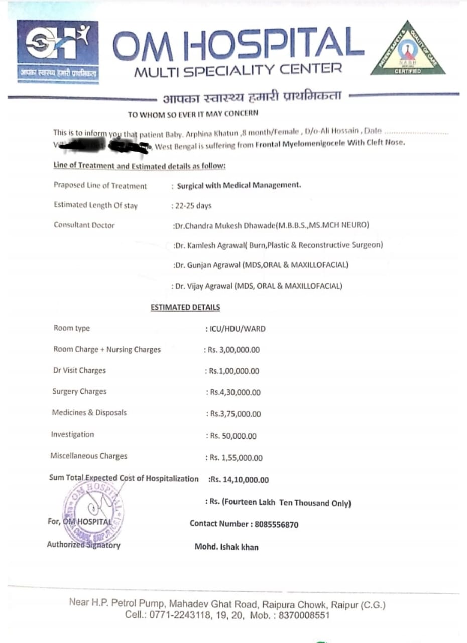 Arphina’s father, Ali Hossain, is a daily wage laborer from a small village in Bihar, West Bengal. With limited resources, he has been struggling to provide for his family, and now, his little daughter’s medical crisis has left him completely helpless. The cost of her life-saving surgery is ₹14,10,000, an amount that is far beyond his reach. He has already borrowed money, sought help from friends, and done everything he can to arrange funds—but it is simply not enough. Her condition requires an urgent, multi-specialty surgery that will reduce the pressure on her skull, correct the cleft nose, and allow her to live without pain. Doctors at Om Hospital have confirmed that she needs immediate treatment to avoid further complications.