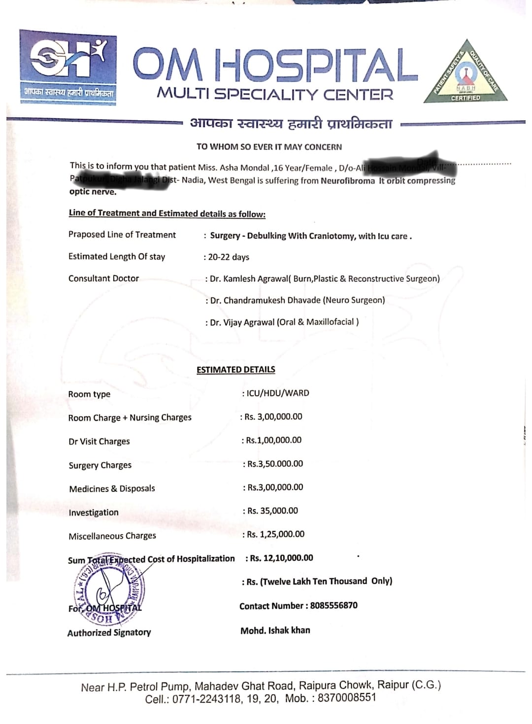 The only way to stop Asha’s condition from worsening is an urgent, complex surgical procedure (Debulking with Craniotomy). This surgery will remove the tumor, relieve pressure on her optic nerve, and restore her ability to see and live without pain. But the financial burden is overwhelming. The total cost of ₹12,10,000 is impossible for her family to bear alone. Asha’s father, a daily wage farmer, has done everything in his power—taking loans, borrowing from friends, and cutting down on essentials. Now, with time running out, they have no one left to turn to except kind-hearted souls like you.