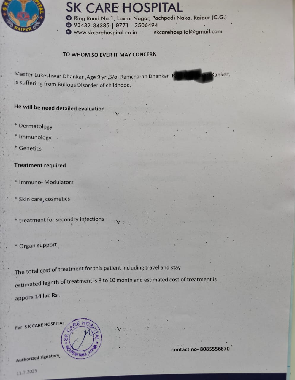 Lukeshwar Dhankar looks like any other child, but his life is nothing close to ordinary. Born with a rare condition known as Bullous Disorder of Childhood, his skin is as fragile as paper. A slight scratch? It tears. A minute in the sun? It blisters. And sometimes, even without any touch at all, his body starts bleeding.