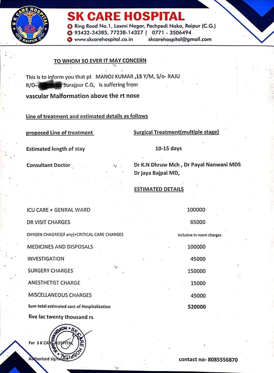 Without this surgery, Manoj’s condition will continue to worsen. He’s already facing physical pain, emotional trauma, and isolation.He’s just a boy — not a patient, not a burden. He deserves school, friends, a normal life — and the chance to chase his dream.