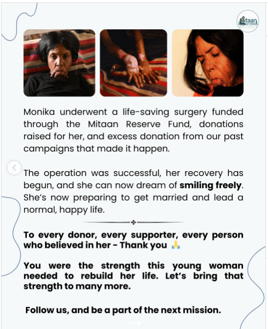 To everyone who donated, shared, and supported Monika, thank you for being part of her healing. Together, we’ve not just treated burns, we’ve reignited hope.