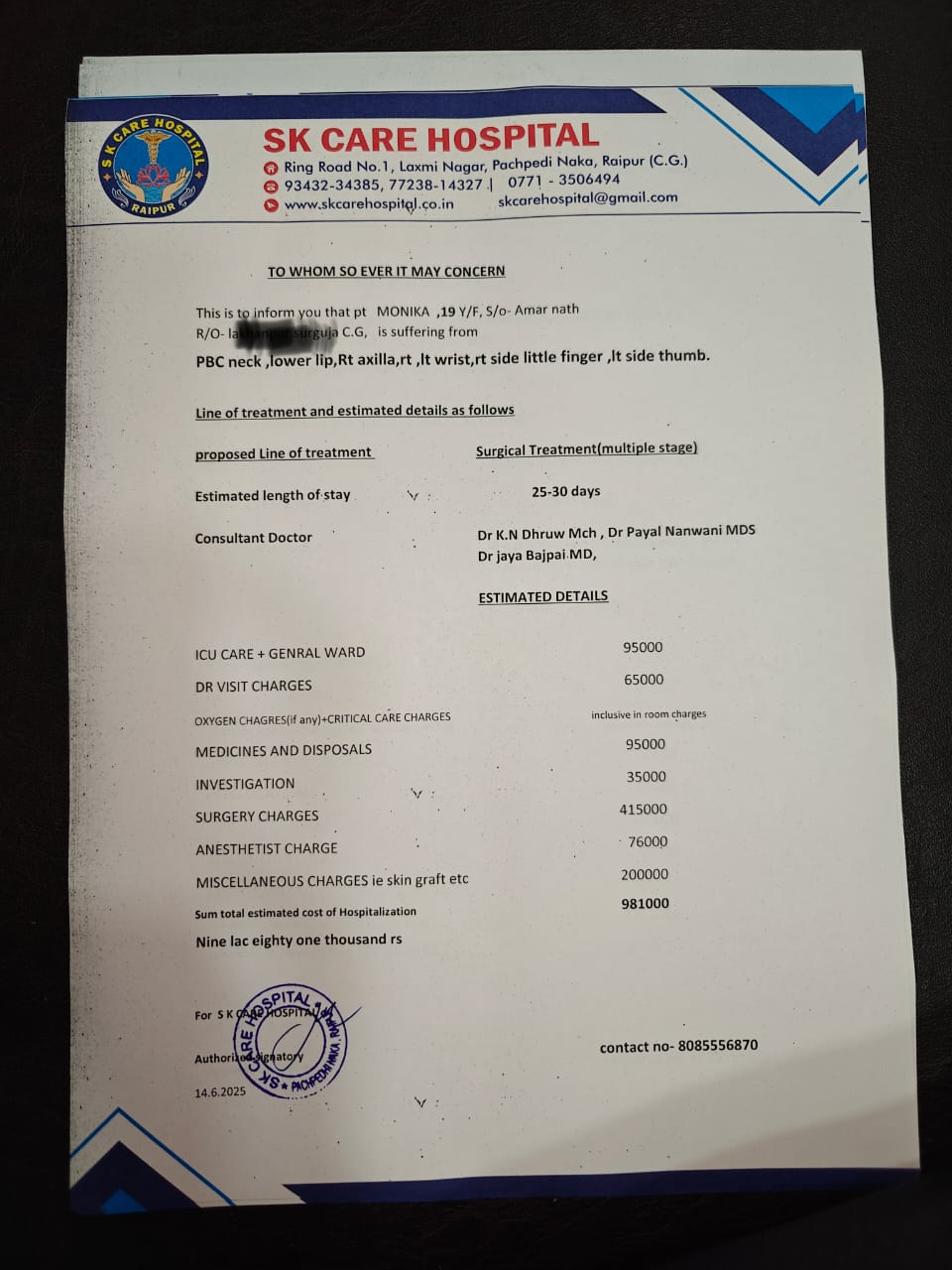 Monika is now 19. Her will is strong, but her body needs help. Doctors have recommended a multi-stage surgical treatment under certain specialists. The procedure includes ICU care, surgery, skin grafts, medications, and recovery support. The total cost: ₹9,81,000. Without this treatment, her hand may never regain full functionality. Her burns may cause long-term health issues and infections. And most of all—her dreams of education, independence, and dignity may slip away forever.