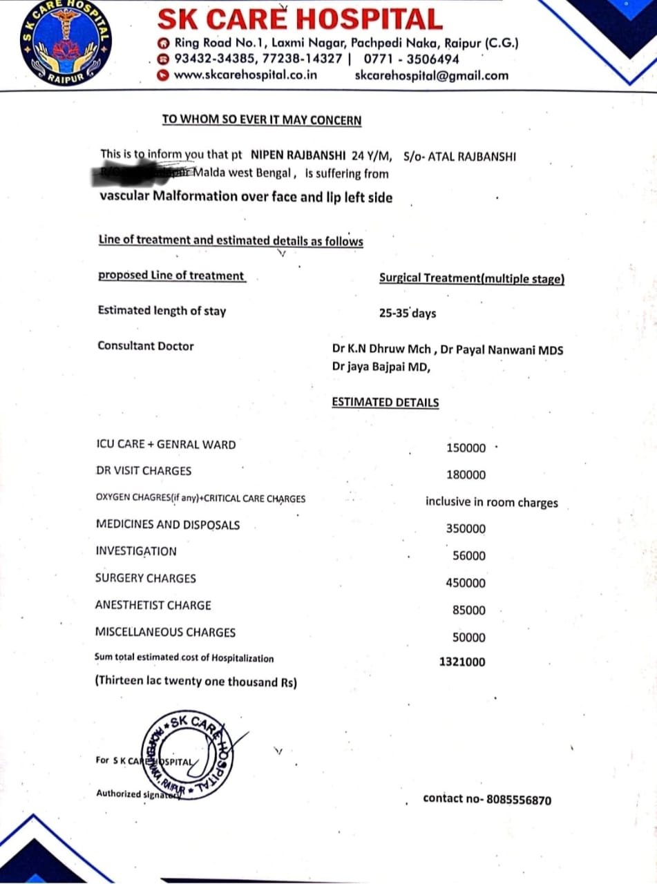 Doctors have confirmed that Nipen’s condition has reached a critical stage.The only way forward is a multi-stage surgical treatment that will remove the affected tissue and stop the bleeding.Without it, the condition could worsen, leading to infection, further disfigurement, and even life-threatening complications.The estimated cost of the complete treatment is ₹13,21,000—a sum his family simply cannot afford.