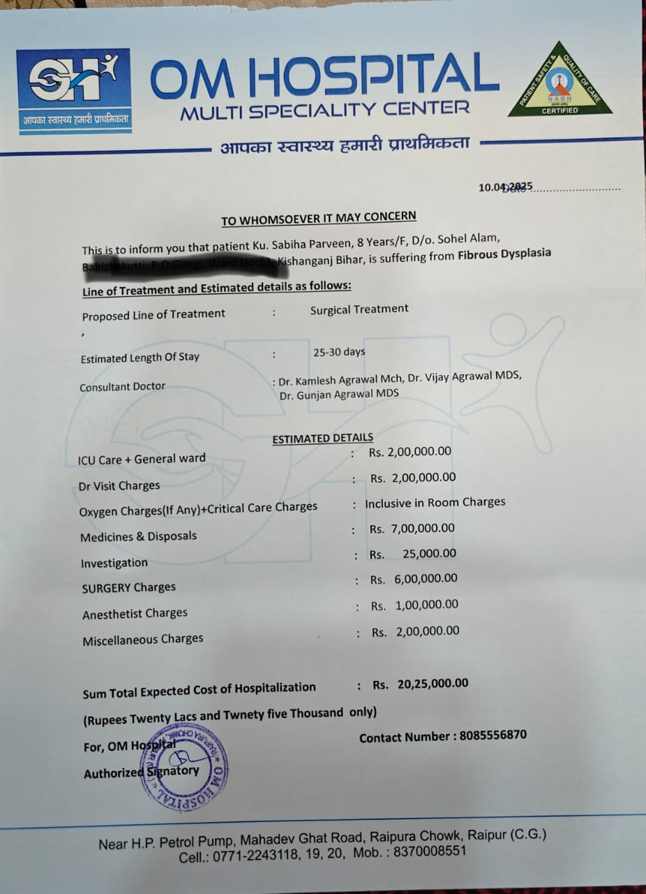 She tries to be brave. But the pain is constant. Eating is a struggle. Sleeping is rare. Playing? That feels like a distant dream. Her name is Sabiha Parveen, and she is just 8 years old. She should be worrying about school books and cartoons—not facing the agony of Fibrous Dysplasia, a rare bone condition that has severely affected her face. Doctors have confirmed that she needs urgent surgery. If delayed, her condition could worsen rapidly, making treatment even more complex and painful.