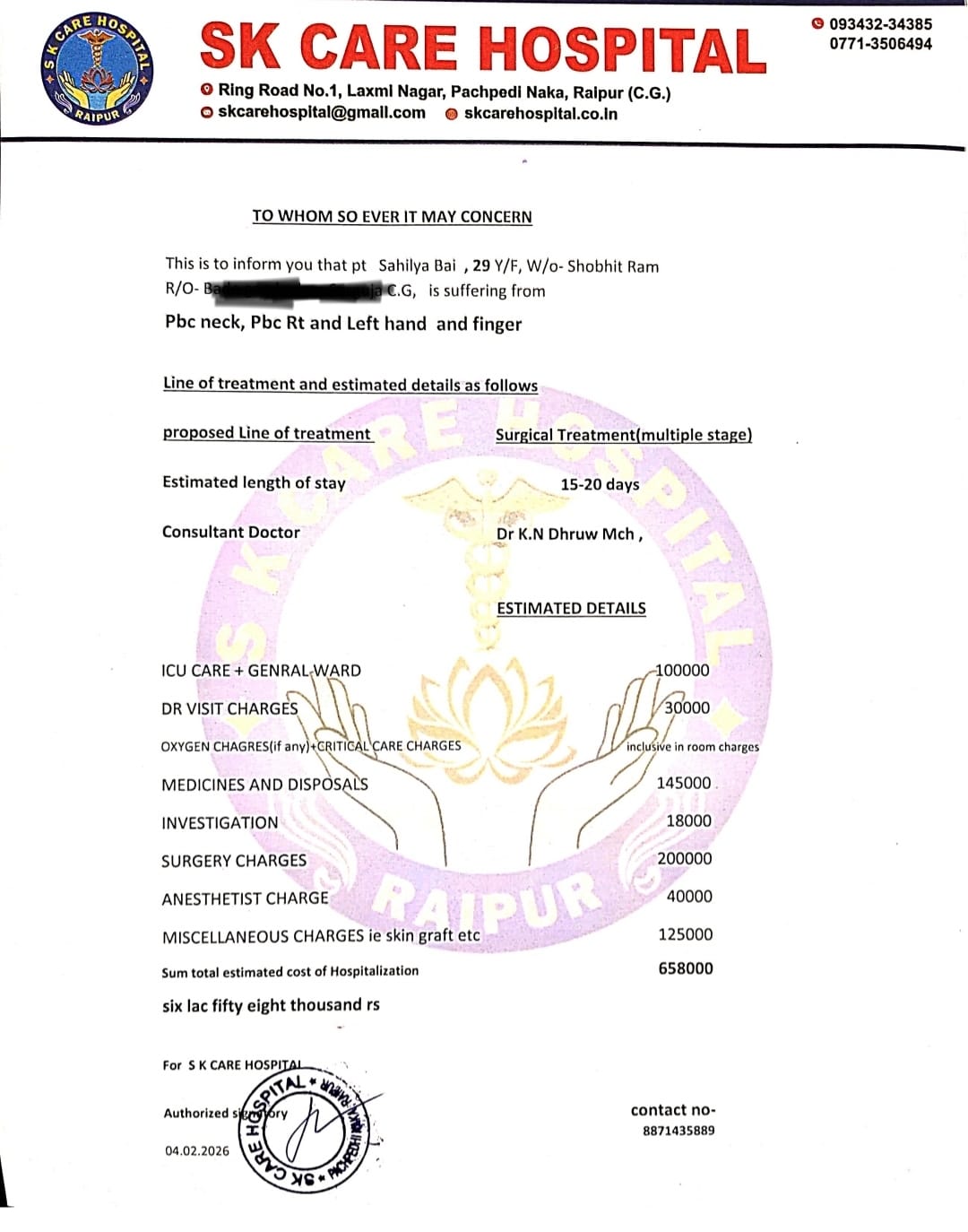 Doctors have estimated that Sahilya’s treatment, including long term burn care and reconstructive procedures, will cost ₹6,78,450. For this family, this amount is impossible to arrange on their own.