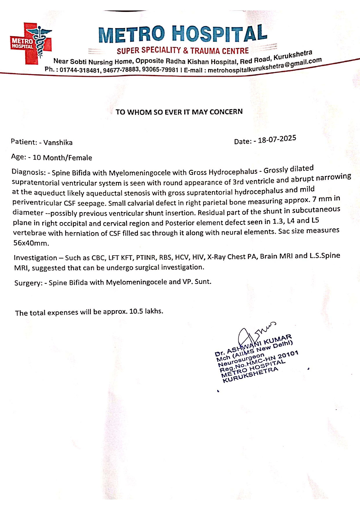 Doctors have recommended urgent spinal and brain surgery (VP Shunt insertion) to drain the fluid and relieve pressure from her brain. According to the medical estimate issued by the hospital, the total cost of treatment is ₹10.5 lakhs.